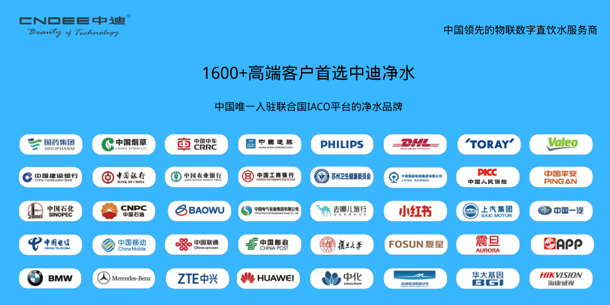 CNDEE 中迪(深圳)直饮水品牌依托总部的高端工艺与严苛品质标准,专注商用净水设备,为企业、学校、工厂、医院及公共机构等商用场景提供高品质直饮水设备,满足多元化饮水需求。